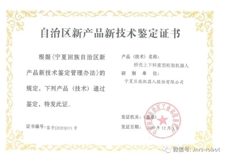 巨能機(jī)器人針對商用車車橋橋殼單機(jī)加工效率低、零件無法自動兼容、混線生產(chǎn)等問題,研制了龍門結(jié)構(gòu)的橋殼上下料重型桁架機(jī)器人。近日,產(chǎn)品通過了自治區(qū)新產(chǎn)品鑒定評審,獲得鑒定證書。