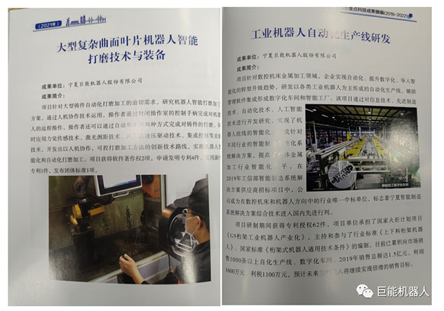 在《銀川市重點(diǎn)科技成果摘編(2016-2022年)》中,巨能機(jī)器人公司的《工業(yè)機(jī)器人自動(dòng)化生產(chǎn)線(xiàn)研發(fā)項(xiàng)目》、《大型復(fù)雜曲面葉片機(jī)器人智能打磨技術(shù)與裝備》、《工業(yè)機(jī)器人視覺(jué)關(guān)鍵技術(shù)的研發(fā)與應(yīng)用》、《工業(yè)機(jī)器人集成核心技術(shù)研發(fā)》、《柴油機(jī)缸蓋重型加工自動(dòng)化產(chǎn)線(xiàn)研發(fā)》、《工業(yè)機(jī)器人智能分揀單元研發(fā)》等多項(xiàng)科技成果被收錄其中。