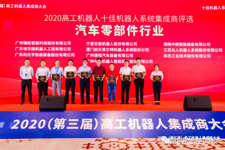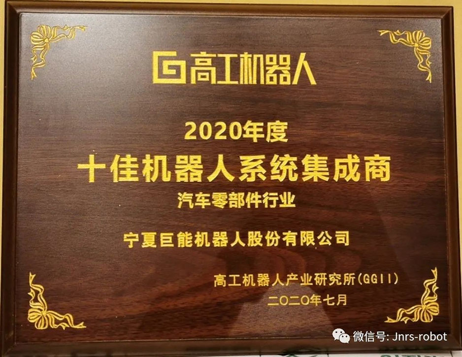 巨能機(jī)器人借專業(yè)的技術(shù)能力和優(yōu)秀的市場(chǎng)表現(xiàn),成功斬獲“2020高工機(jī)器人十佳機(jī)器人系統(tǒng)集成商-汽車零部件行業(yè)”大獎(jiǎng)。