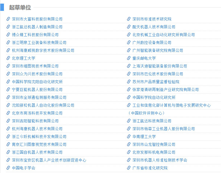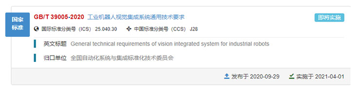 2020年9月29日,由巨能機(jī)器人參與編制的國家標(biāo)準(zhǔn)《工業(yè)機(jī)器人視覺集成系統(tǒng)通用技術(shù)要求》獲批正式發(fā)布,標(biāo)準(zhǔn)編號(hào)為GB/T 39005-2020,該標(biāo)準(zhǔn)將于2021年4月1日起正式實(shí)施。