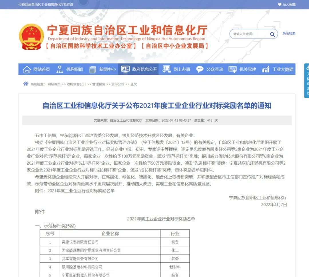 近日,自治區(qū)工業(yè)和信息化廳公布了2021年度工業(yè)企業(yè)行業(yè)對(duì)標(biāo)獎(jiǎng)勵(lì)名單。根據(jù)《寧夏回族自治區(qū)工業(yè)企業(yè)行業(yè)對(duì)標(biāo)獎(jiǎng)勵(lì)管理辦法》(寧工信規(guī)發(fā)〔2021〕12號(hào))的有關(guān)規(guī)定,自治區(qū)工業(yè)和信息化廳組織開(kāi)展了2021年度工業(yè)企業(yè)行業(yè)對(duì)標(biāo)獎(jiǎng)勵(lì)評(píng)選工作。經(jīng)過(guò)企業(yè)申報(bào)、初審、專家評(píng)審等程序,巨能機(jī)器人等5家企業(yè)為2021年度工業(yè)企業(yè)行業(yè)對(duì)標(biāo)“示范標(biāo)桿獎(jiǎng)”企業(yè)并授予獎(jiǎng)牌。