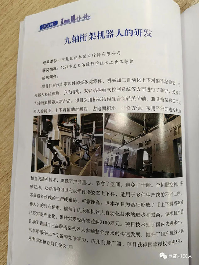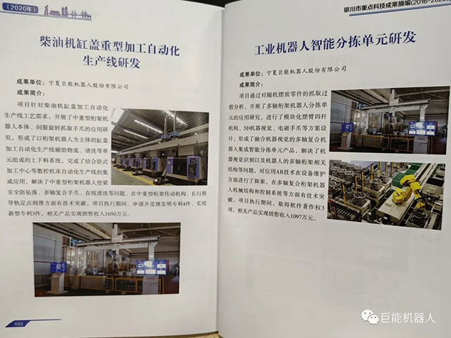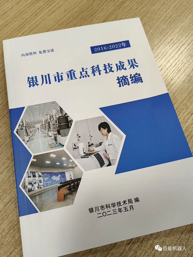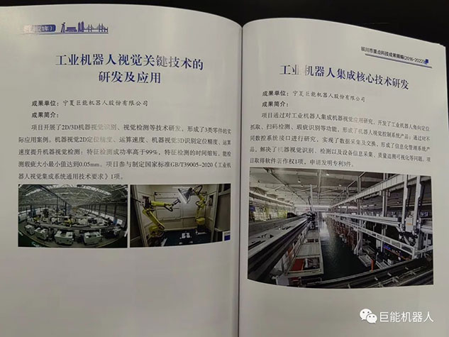 在《銀川市重點(diǎn)科技成果摘編(2016-2022年)》中,巨能機(jī)器人公司的《工業(yè)機(jī)器人自動化生產(chǎn)線研發(fā)項(xiàng)目》、《大型復(fù)雜曲面葉片機(jī)器人智能打磨技術(shù)與裝備》、《工業(yè)機(jī)器人視覺關(guān)鍵技術(shù)的研發(fā)與應(yīng)用》、《工業(yè)機(jī)器人集成核心技術(shù)研發(fā)》、《柴油機(jī)缸蓋重型加工自動化產(chǎn)線研發(fā)》、《工業(yè)機(jī)器人智能分揀單元研發(fā)》等多項(xiàng)科技成果被收錄其中。