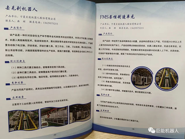 在《銀川市科技創(chuàng)新產(chǎn)品(2023)手冊》中,巨能機(jī)器人公司《去毛刺機(jī)器人》和《FMS柔性制造單元》兩項(xiàng)產(chǎn)品收錄其中。