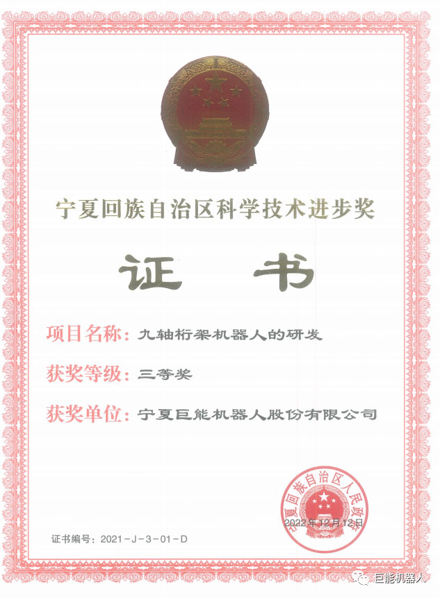 其中,《九軸桁架機(jī)器人的研發(fā)項(xiàng)目》榮獲2021年自治區(qū)科學(xué)技術(shù)進(jìn)步三等獎。
