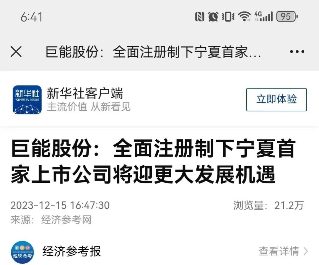 【題記】2023年12月15日,新華社客戶端刊發(fā)《巨能股份:全面注冊制下寧夏首家上市公司將迎來更大發(fā)展機(jī)遇》(詳情見原文鏈接),以下為報道全文。