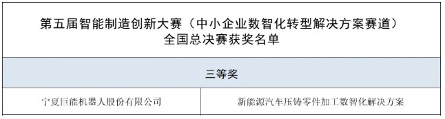 12月3日至4日,第五屆智能制造創(chuàng)新大賽(中小企業(yè)數(shù)智化轉(zhuǎn)型解決方案賽道)全國總決賽在湖南長沙舉行。巨能機器人憑《新能源汽車壓鑄零件加工數(shù)智化解決方案》榮獲本屆大賽三等獎。